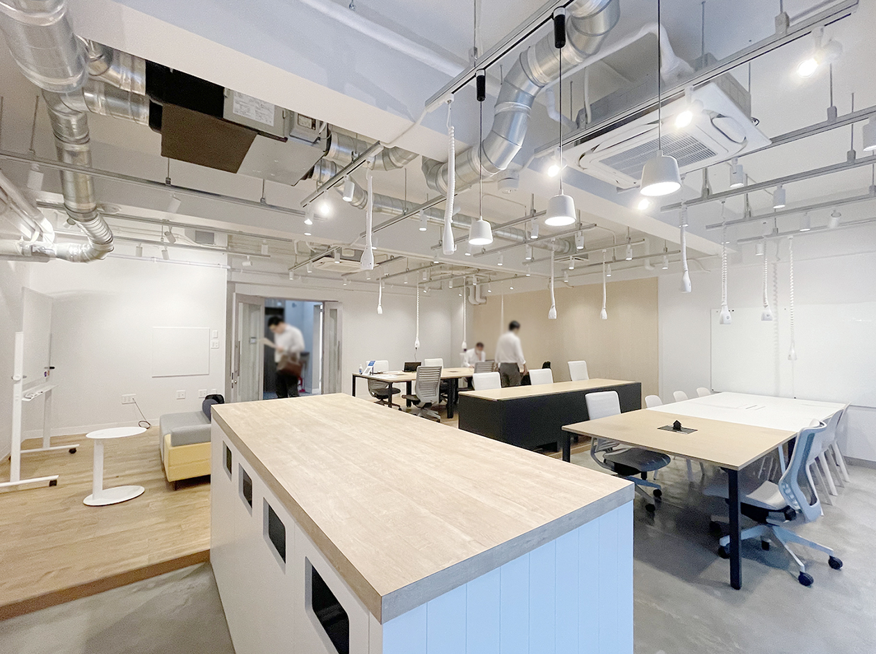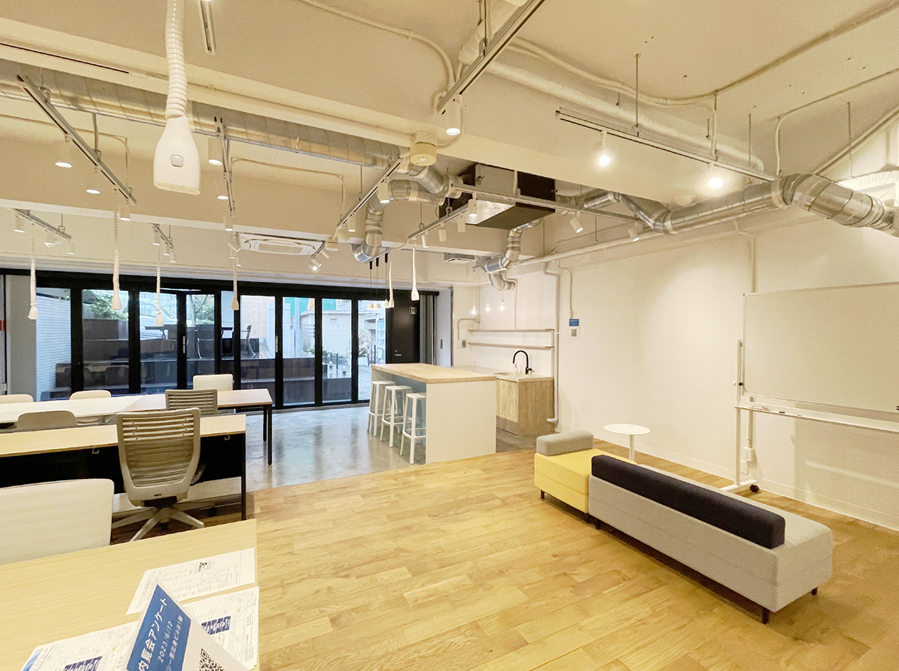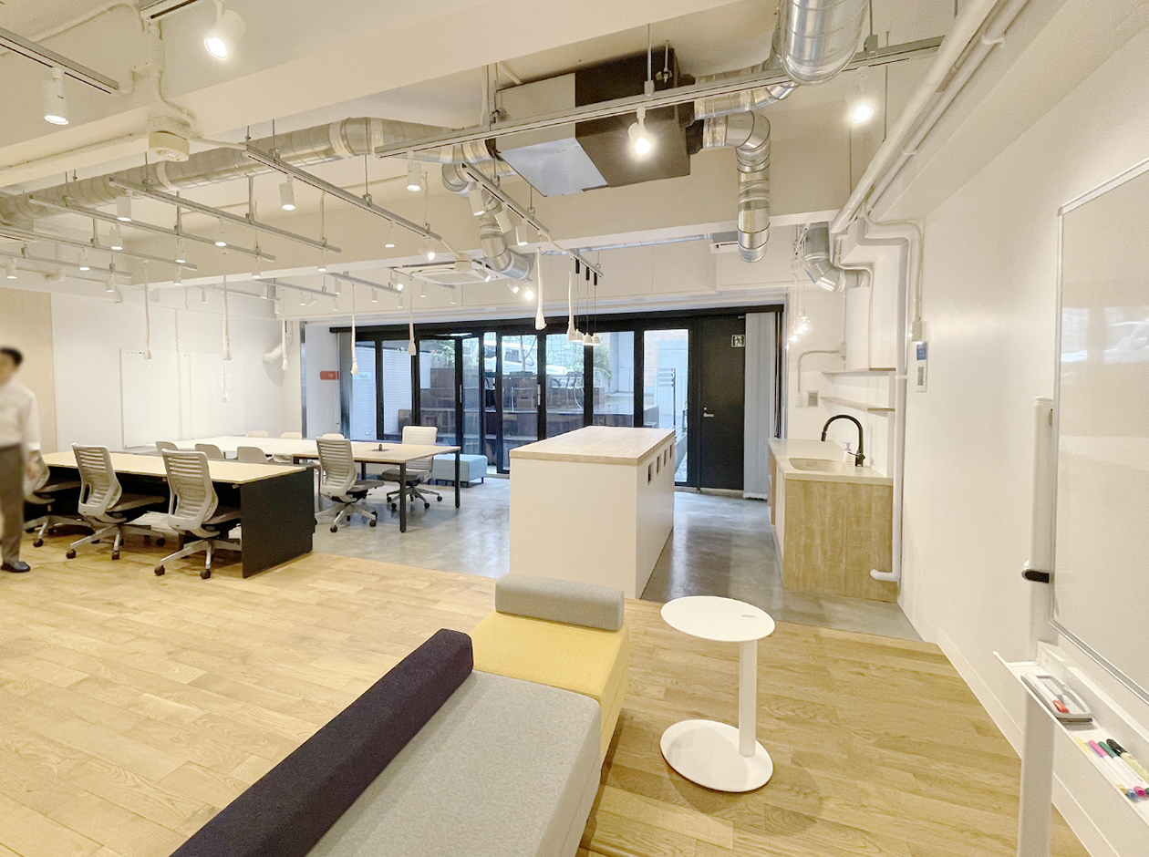 渋谷区の恵比寿に位置するフルセットアップオフィスです。東京メトロ銀座線、JR山手線、JR埼京線が利用できる恵比寿駅が最寄り駅になります。貸室内には、6名用会議室を1室、カウンター、ソファ、執務スペースには約17名用のデスクがあります。木の温もりがあるデザインで天井も高く、専用テラス付きのお洒落な内装です。 ※室内写真は一部現況と異なる場合がございます