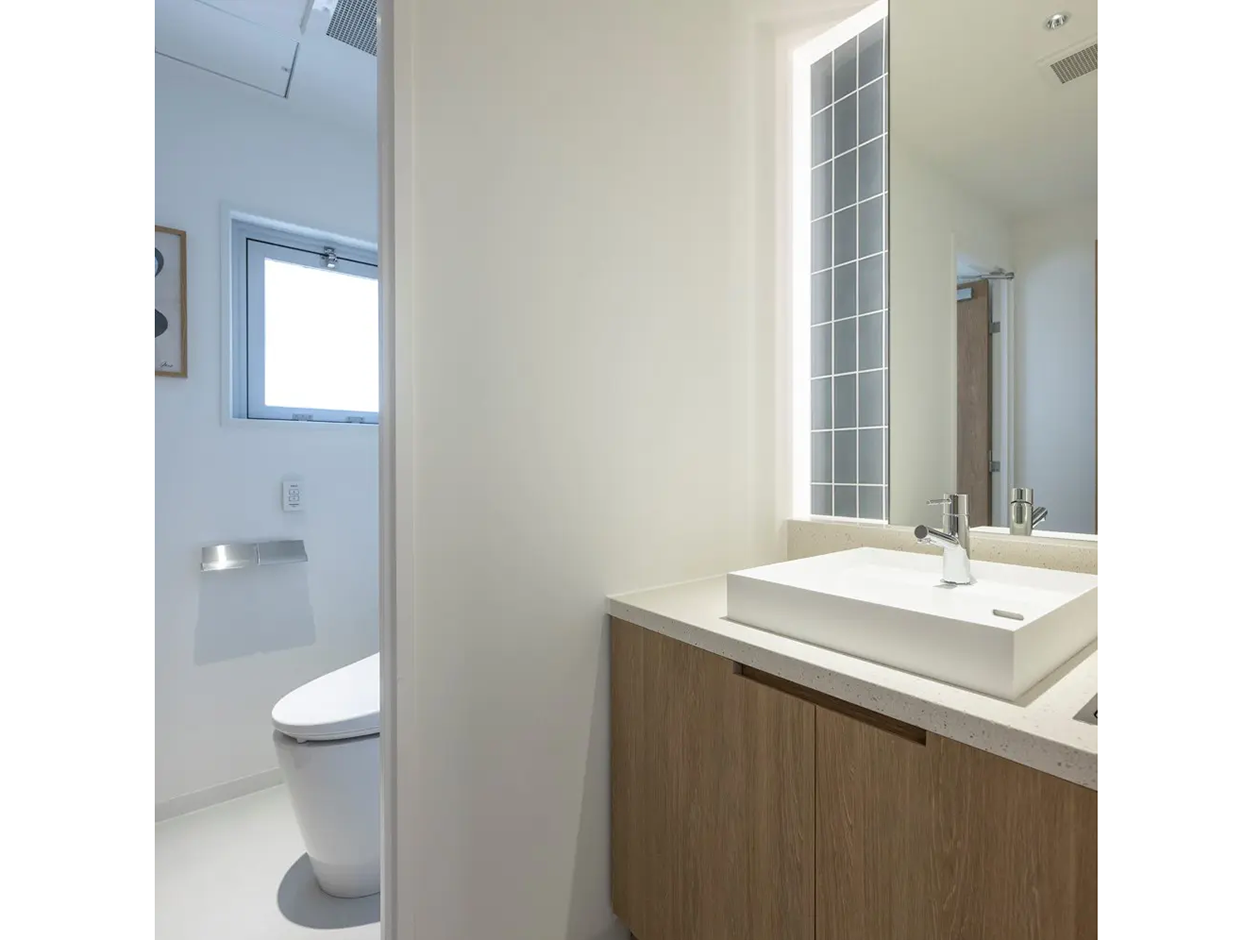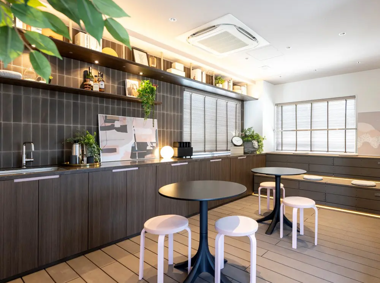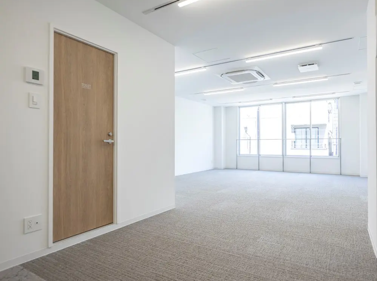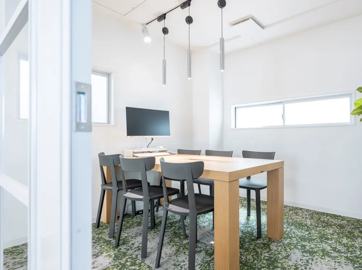 墨田区・錦糸町エリアに位置する、什器付きセットアップオフィスです。貸室内は、6名用の会議室が設置されています。多様なシーンを想定した空間構成で、多くの可能性を実現できるフレキシブルな機能をもっています。トイレは室外で男女別になっています。広めのキッチンカウンターを配置。階段状のベンチは、セミナー等でひな壇にも利用できます。