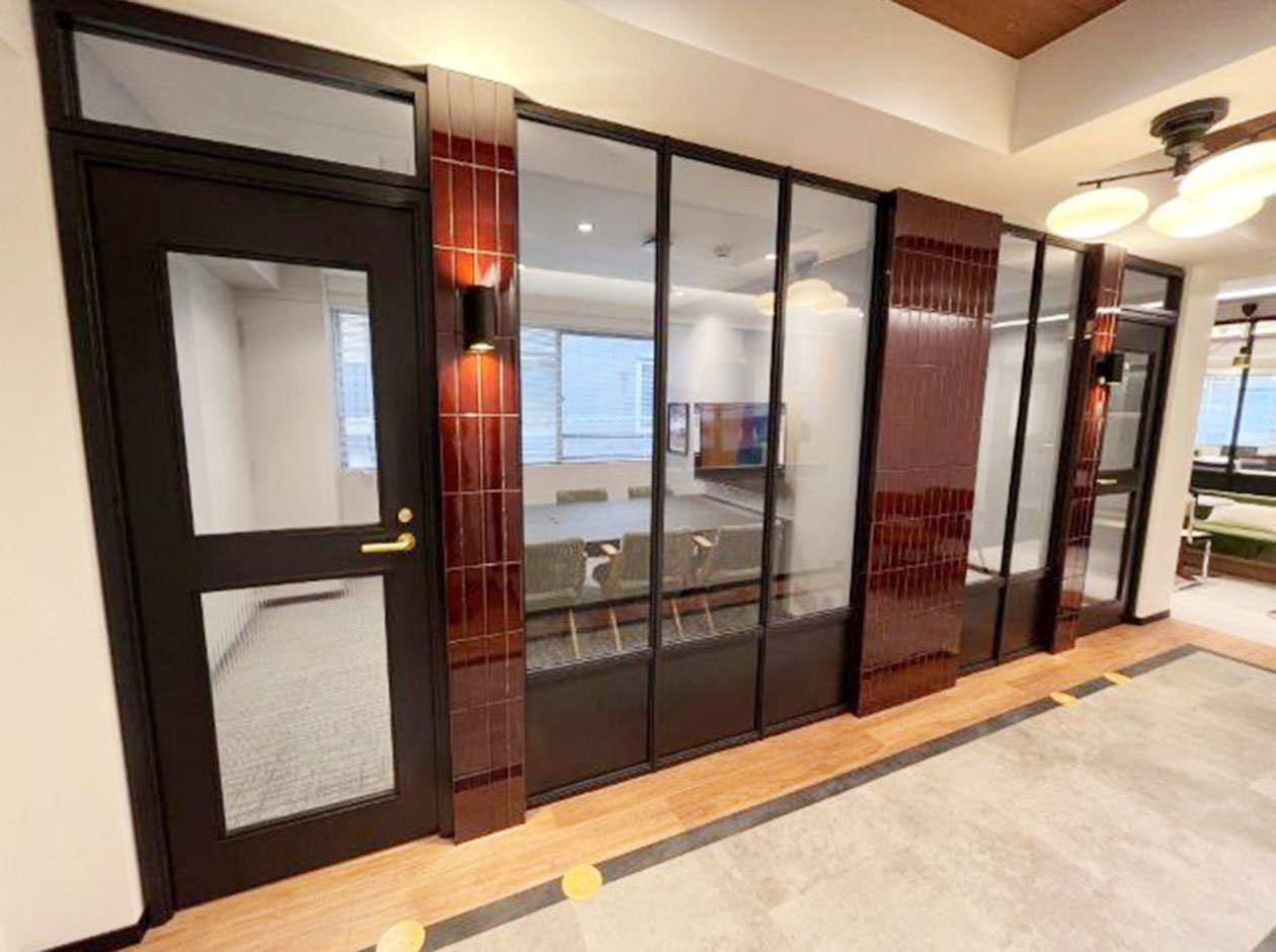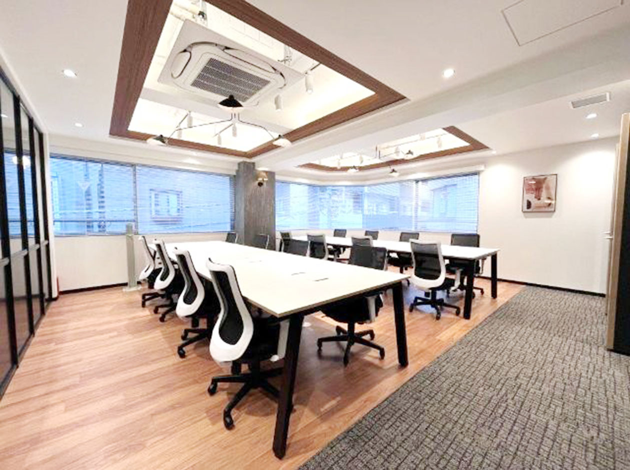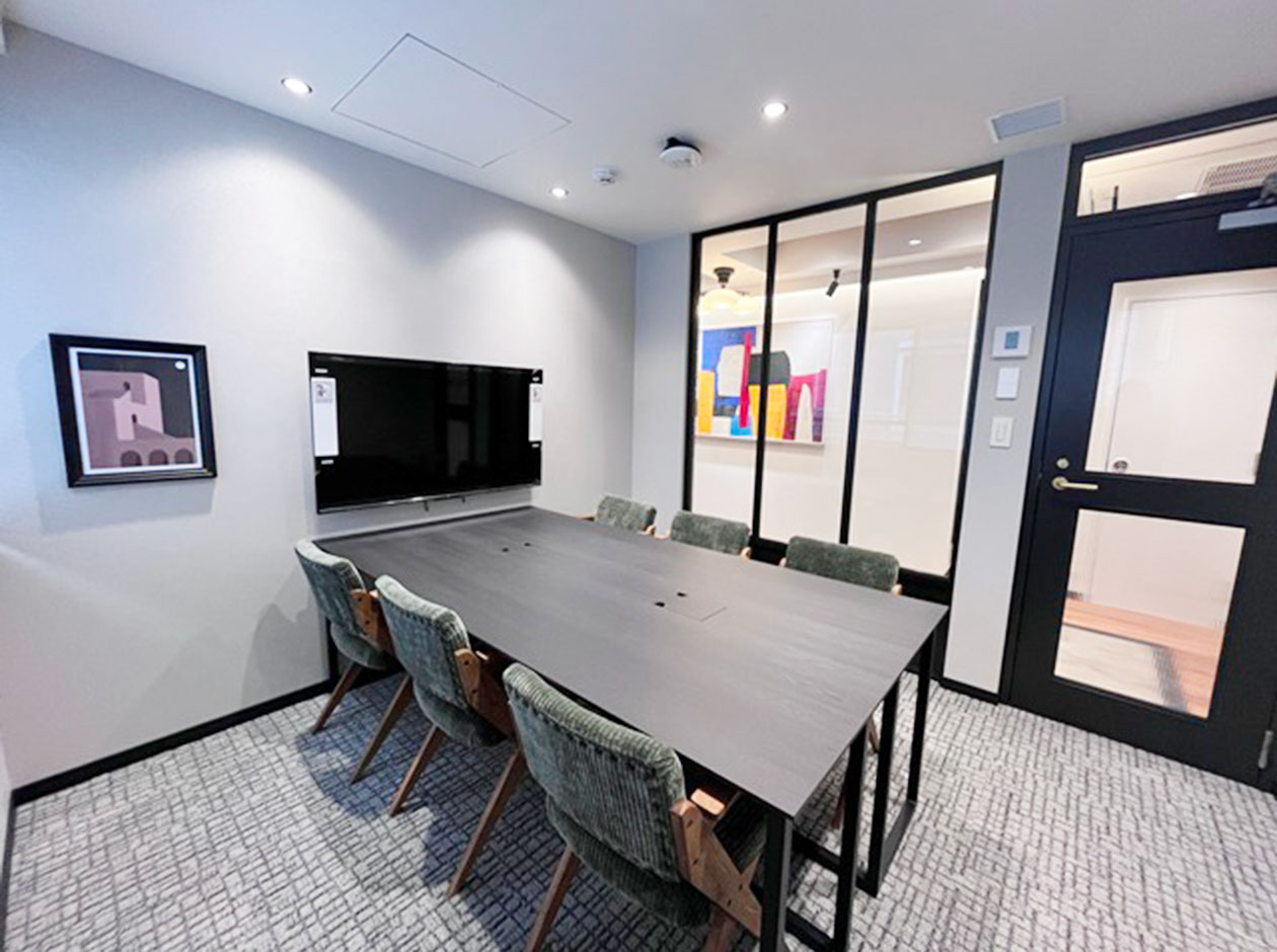中央区・八丁堀エリアに位置する、フルセットアップオフィスです。2025年に外観・エントランスのリニューアル工事が完了しています。貸室内には、6名用会議室、4名用会議室、モニター付きラウンジ、テレカンブースが設置されています。執務室には、16名分のデスク・チェアが完備されています。トイレは男女別になっています。