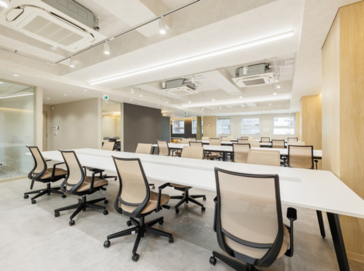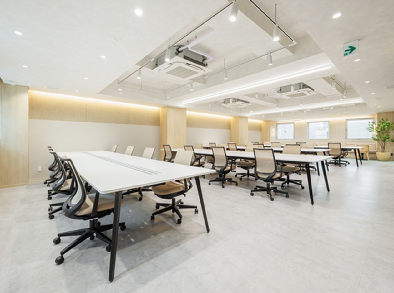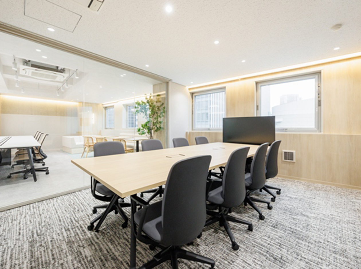 港区・芝エリアに位置する、フルセットアップオフィスです。最寄り駅は、三田駅となっております。貸室内には、8名用会議室、6名用会議室、受付、ラウンジ、フォンブースが設置されています。また、執務室には32席分の什器が設置されており、入居後すぐに業務を開始できます。アースカラーで統一された落ち着きのある色調となっております。