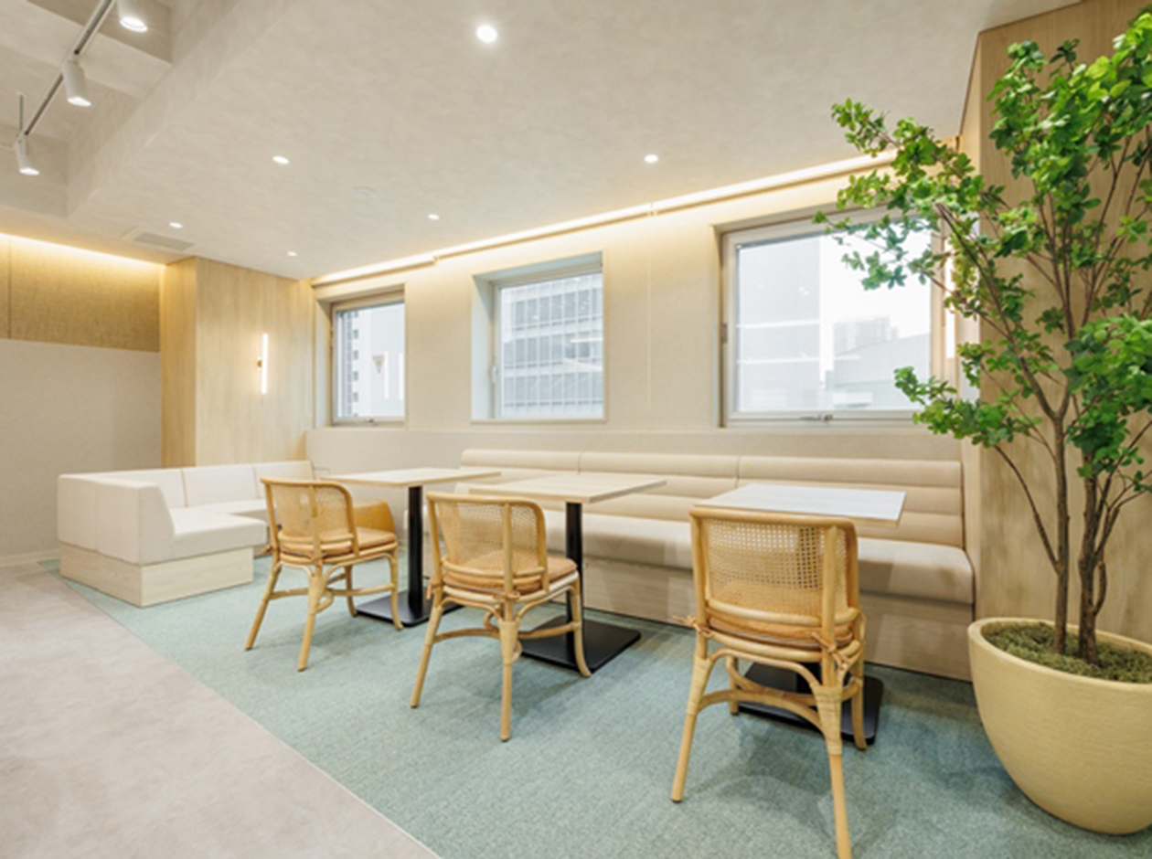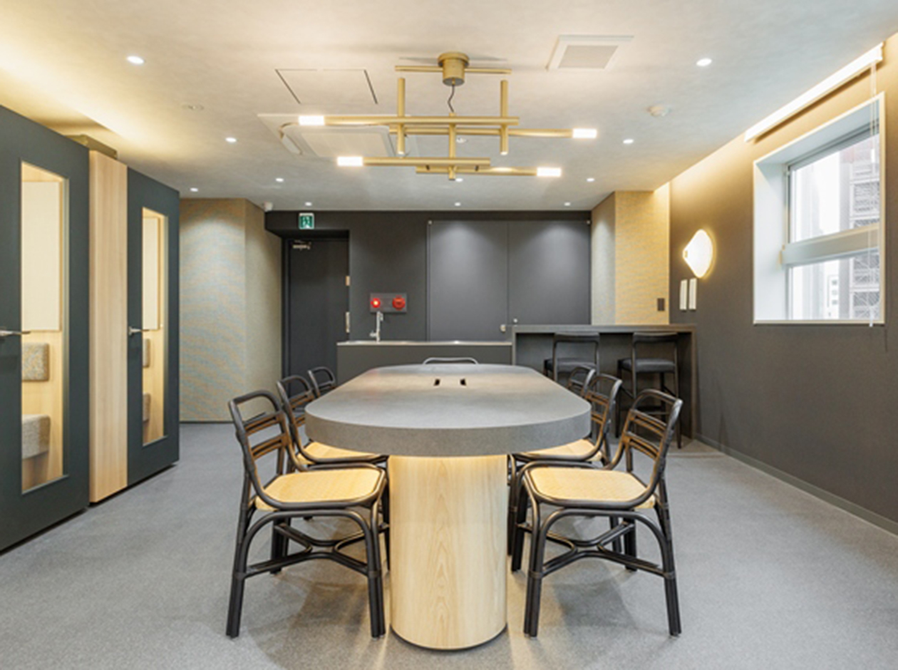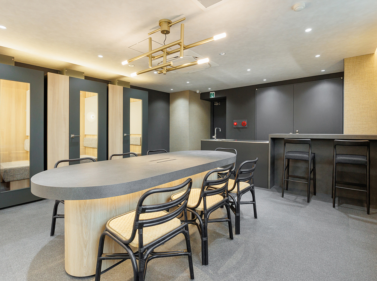 港区・芝エリアに位置する、フルセットアップオフィスです。最寄り駅は、三田駅となっております。貸室内には、8名用会議室、6名用会議室、受付、ラウンジ、フォンブースが設置されています。また、執務室には32席分の什器が設置されており、入居後すぐに業務を開始できます。アースカラーで統一された落ち着きのある色調となっております。