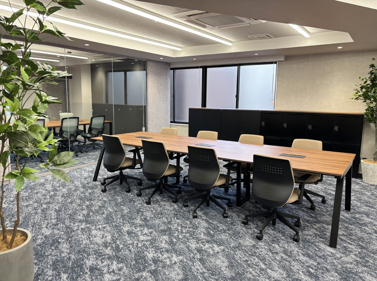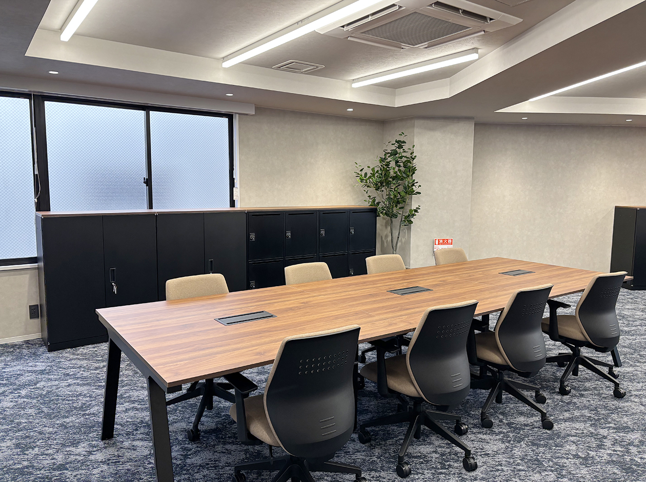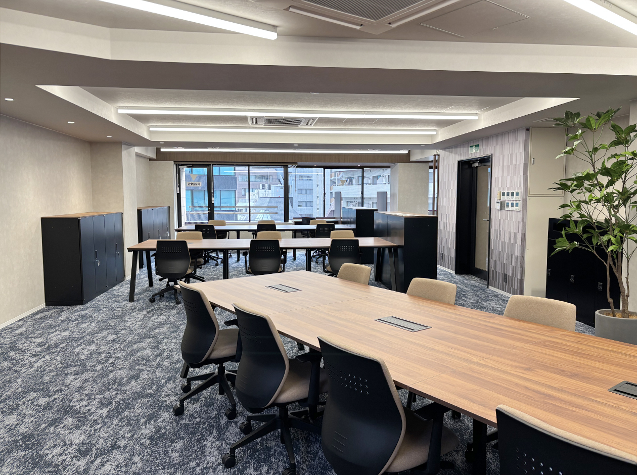 千代田区・飯田橋エリアに位置する、2025年12月工事完成のフルセットアップオフィスです。什器付きのため、初期費用を大幅に削減できます。貸室内には、会議室2室(6名用1室・8名用1室)と22名用のデスク、チェア、キャビネットとラウンジスペース13席を設置しています。ワンフロア・ワンテナントで使い勝手良好です。