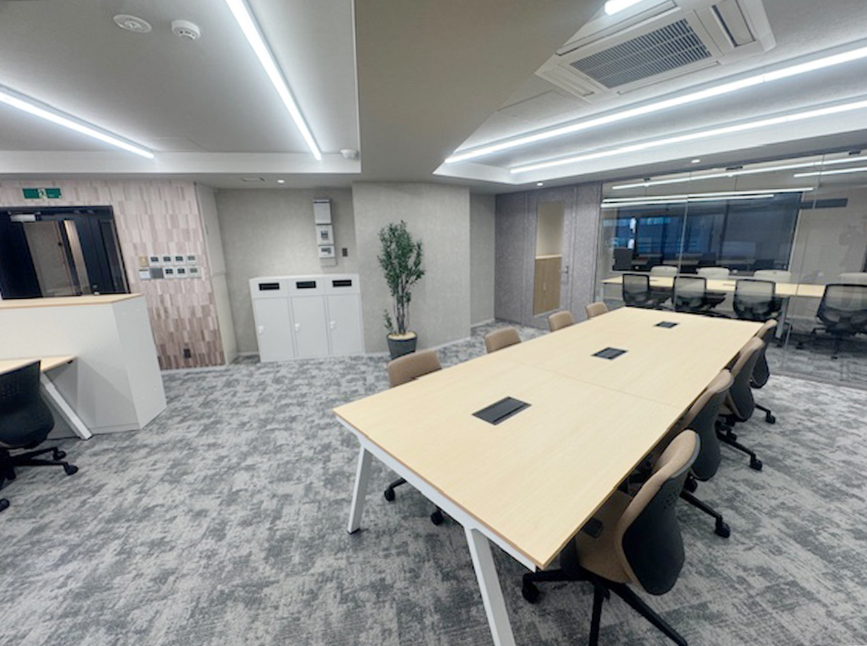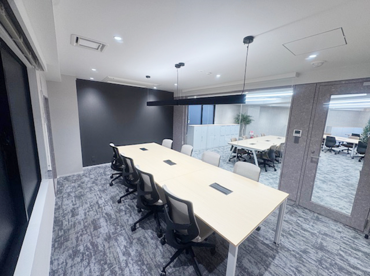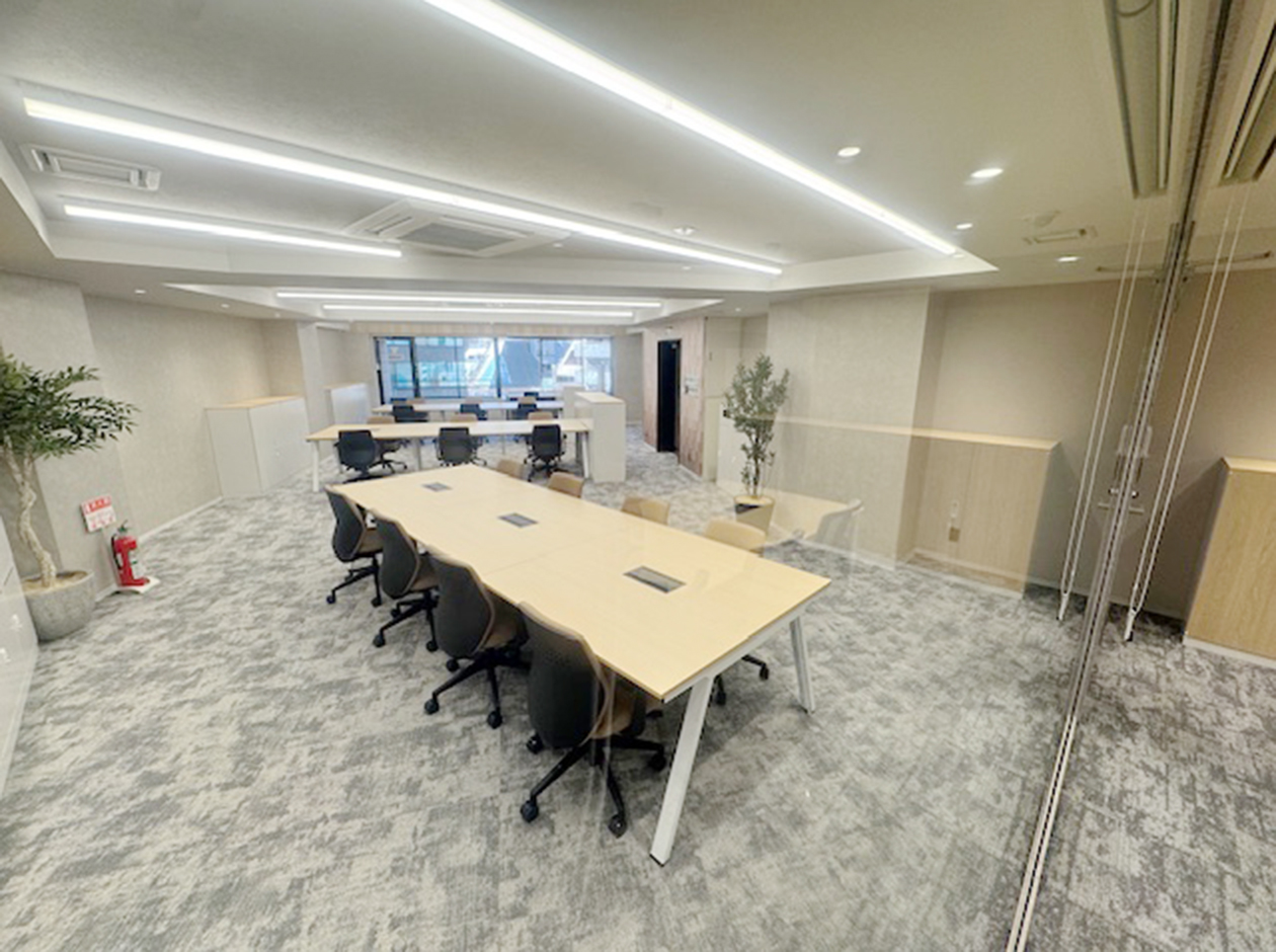 千代田区・飯田橋エリアに位置する、2025年12月工事完成のフルセットアップオフィスです。什器付きのため、初期費用を大幅に削減できます。貸室内には、会議室2室(6名用1室・8名用1室)、22名用のデスクとチェア、キャビネット、ラウンジスペース13席を設置しています。ワンフロア・ワンテナントで使い勝手良好です。